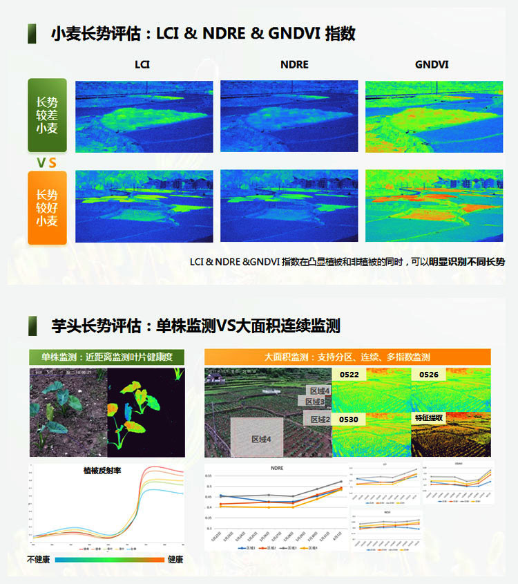 | 植被指数 | 支持NDVI\GNDVI\NDRE\OSAVI\LCI植被指数输出,更多指数可以定制 |