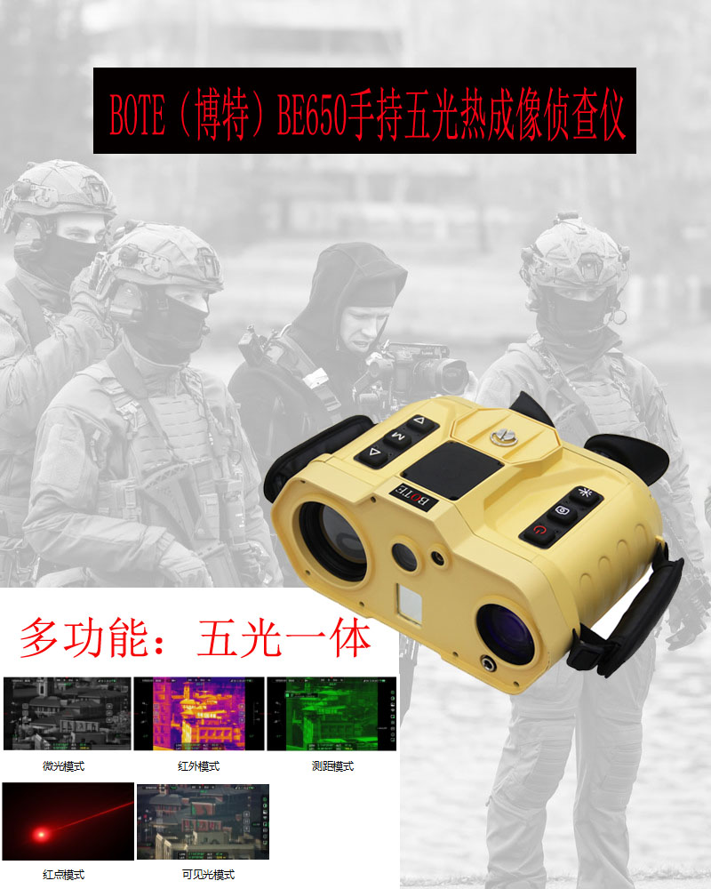BOTE(博特)BE650五光多功能⼿持观察仪是集红外、微光、可⻅光和激光测距、红点指⽰于⼀体的轻量⼩型化智能观察设备,内置定位模块、电⼦罗盘、激光测距、红点指⽰和图像存储功能,具备图像融合功能,可⽤于昼夜观察和⽬标搜索,使⽤舒适,便于携带。它可以⽤于侦察、监视、⼾外狩猎和AN全防护等。