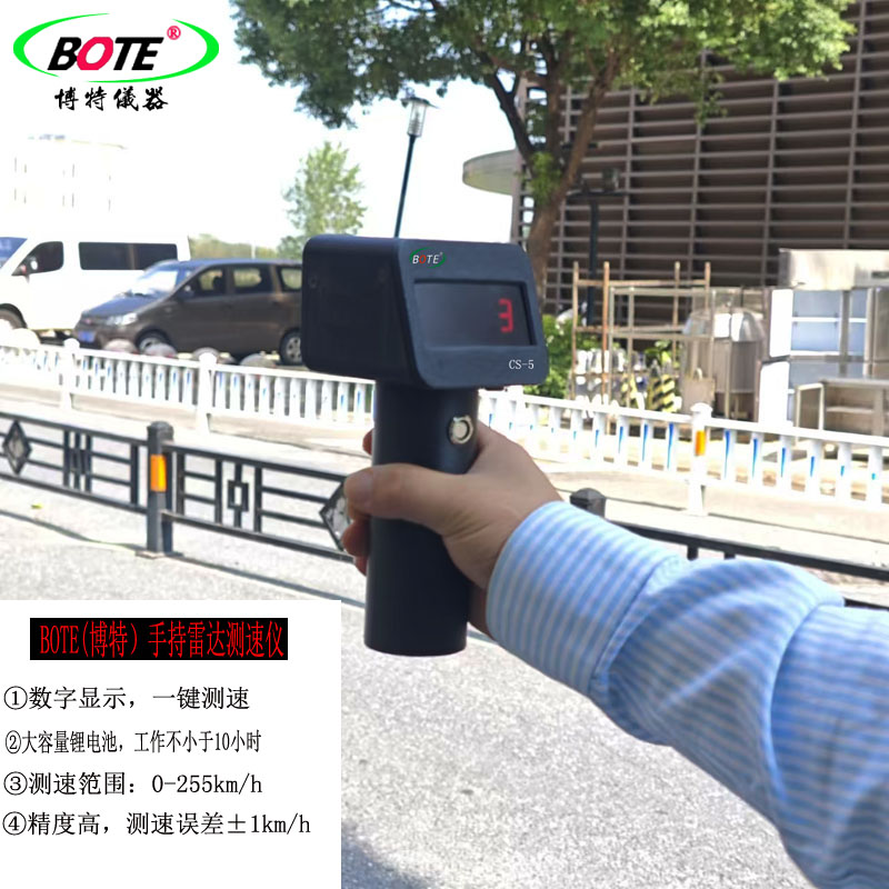 BOTE CS-5型测速仪是一种手提式雷达测速仪,该测速仪利用多谱勒原理,实现对路面运动径向速度的测量。它灵活机动,反应快捷,准度高。CS-5型雷达测速仪配置12V2800mha锂电池,足以保证雷达待机50小时,连续工作10小时。