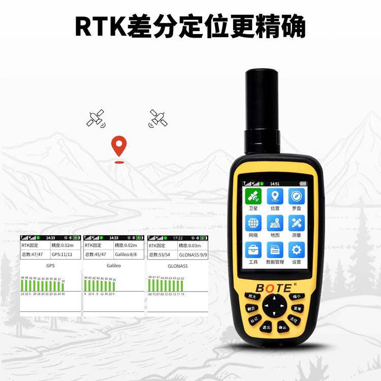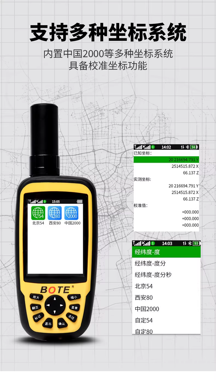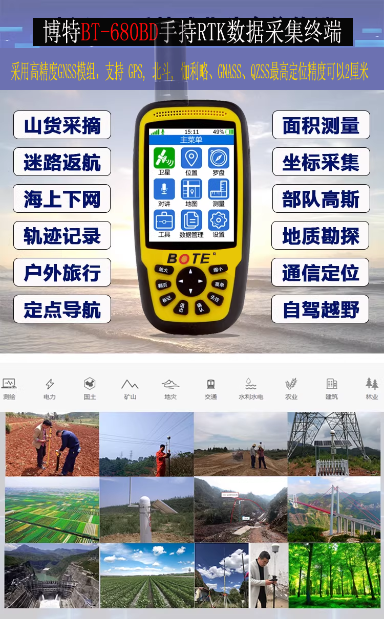 BOTE(博特)BT-680BD是一款内置4G和CORS服务,有云端数据同步功能的的手持式高精度定位仪,采用高精度GNSS模组,支持 GPS, 北斗, 伽利略、QZSS、NavIC、SBAS等卫星导航系统信号接收,RTK固定解状态定位精度可以达到1-2厘米,适用于精准测量场合。本设备在行业应用方面有采点找点,共享AB点,地形测量,多边形面积,环绕面积,直线曲线长度等功能。支持WGS84、中国2000,北京54、西安80、UTM、MGRS、自定义等诸多坐标系。同时还有适合户外运动的电子罗盘和气压计等功能。