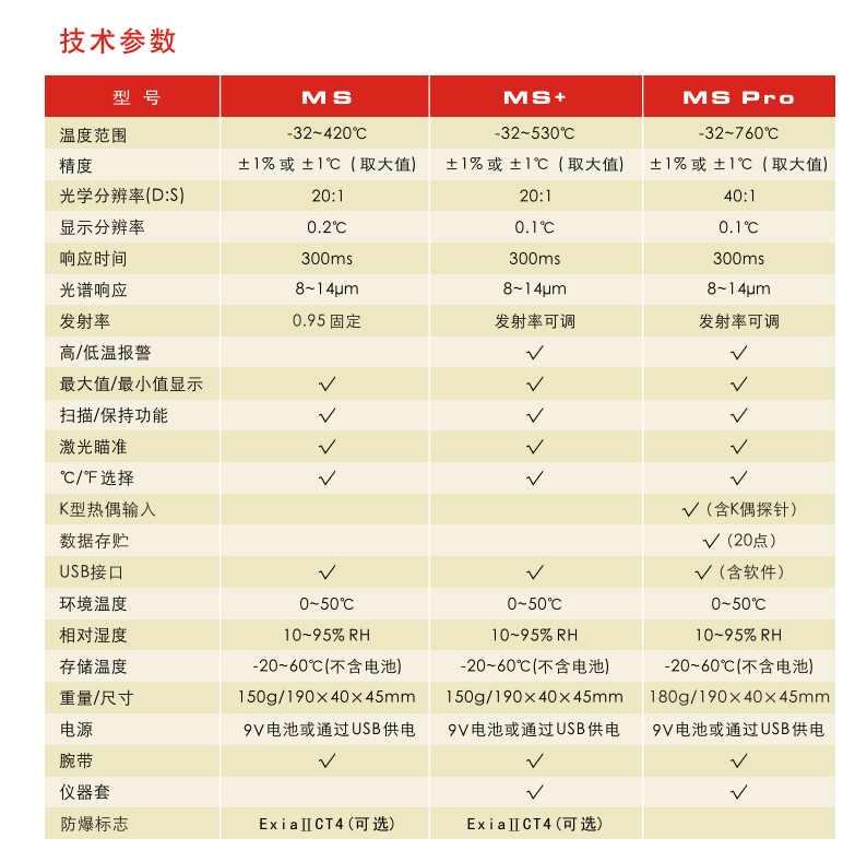 博特MS系列便携式红外测温仪1%精度BOTE手持高精度防爆测温仪±1℃A.博特MS工业红外测温仪测温范围:-32℃-420℃ 精度:±1%或者是1℃(优先取大者可以选配防爆) B.博特MS+工业红外测温仪测温范围:-32℃-530℃ 精度:±1%或者是1℃(优先取大者可以选配防爆)C.博特MS PRO工业红外测温仪测温范围:-32℃-760℃ 精度:±1%或者是1℃(优先取大者带K热电偶测温)TE
